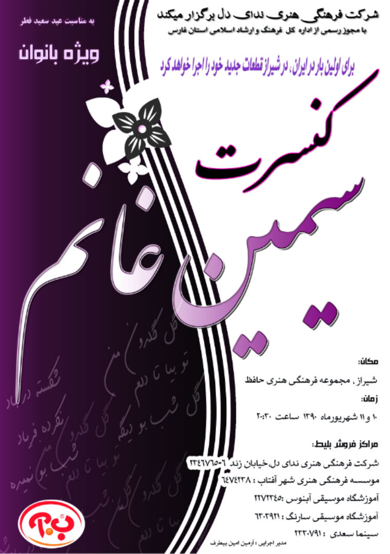 موسیقی ما - سیمین غانم ۱۰ و ۱۱ شهریور ماه ـ همزمان با عید سعید فطر ـ در مجموعه فرهنگی، هنری «حافظ» شیراز به صحنه میرود. آرمین امین بیطرف ـ تهیه کننده و مدیر اجرایی این کنسرت ـ با اعلام این خبر گفت: سیمین غانم متفاوتترین کنسرت خود را به همراه اجرای قطعات جدید در شیراز ویژه بانوان برگزار میکند.
