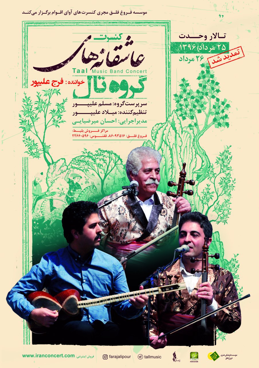 به گزارش «موسیقی ما»، کنسرت گروه «تال» به خوانندگی فرج علیپور که قرار بود 25 مرداد 1396 در تالار وحدت تهران روی صحنه برود، به دلیل استقبال علاقهمندان به موسیقی لُری و لَکی، برای یک شب دیگر تمدید شد.
