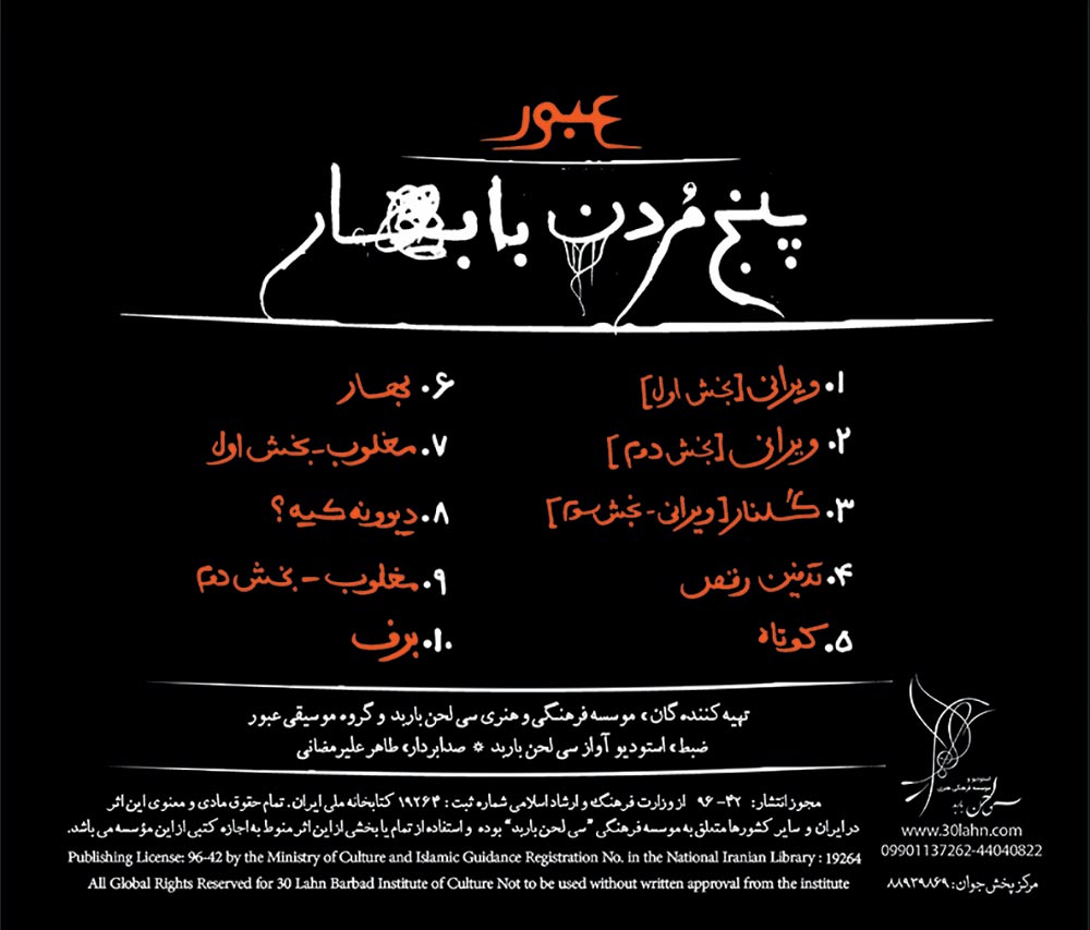 پنج مردن با بهار ،اولین آلبوم رسمی از گروه عبور است. این آلبوم شامل ده آهنگ در سبک پراگرسیو راک است. ویرانی(بخش اول)، ویرانی(بخش دوم)، گلنار(ویرانی بخش سوم)، تدفین رقص، کوتاه، بهار، مغلوب (بخش اول)، دیوونه کیه، مغلوب (بخش دوم) و برف نام آهنگهای این آلبوم است. عبور گروهی شش نفره است که با آثار بیکلام یا آثاری با اشعار مدرن قصد دارد موسیقی غرب و شرق را در دل سبک راک به هم پیوند دهد. نتیجه این تلاش را میتوانید در آلبوم پنج مردن با بهار گوش کنید.