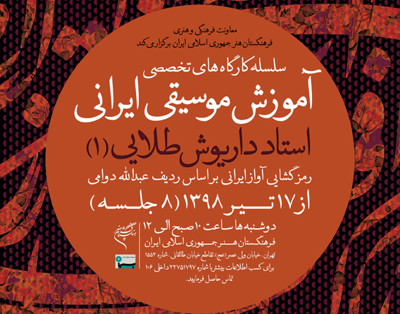 کارگاه تخصصی آواز ایرانی، از 17 تیرماه آغاز میشود و به مدت 8 جلسه، روزهای دوشنبه از ساعت 10 تا 12، در فرهنگستان هنر به نشانی خیابان ولیعصر، تقاطع خیابان طالقانی، شماره 1552 برپا خواهد شد.