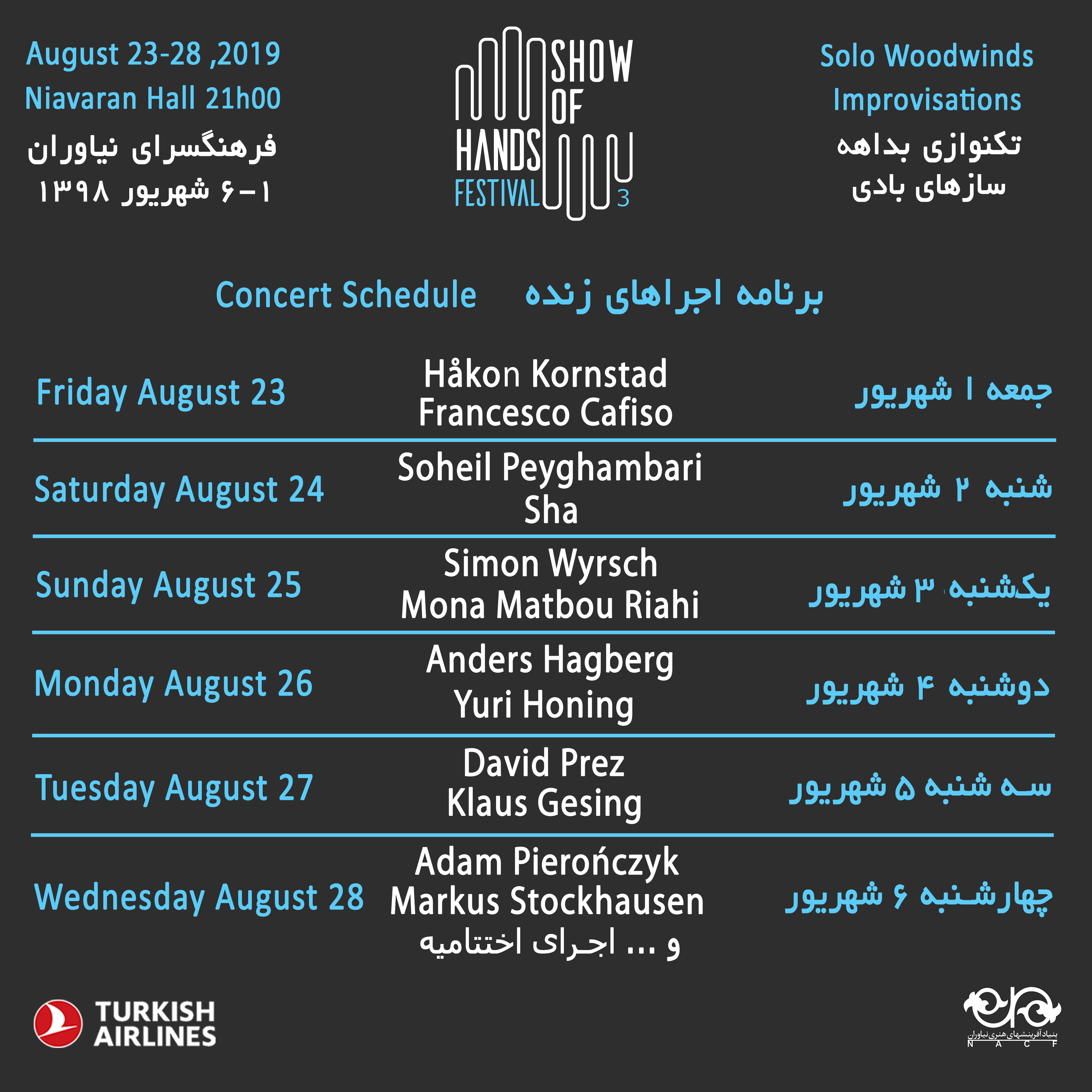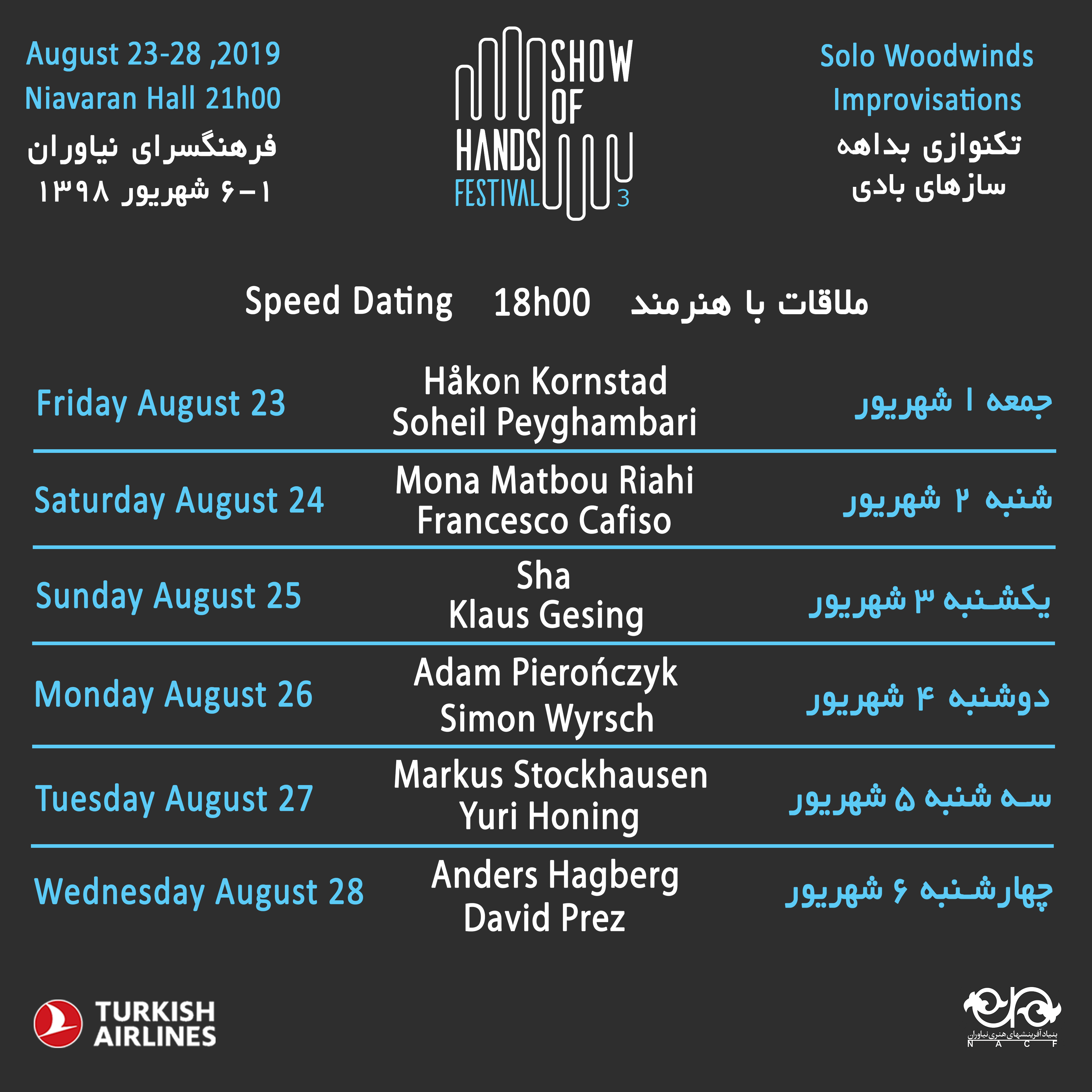 فرانچسکو کافیسو (ایتالیا)، هاکون کورنشتاد (نروژ)، اشتفان هاسلباخر (سوییس)، سهیل پیغمبری (ایران) ،سیمون ویرش (سوییس)، مونا ریاحی (ایران)، آندرس هاگبرگ (سوئد)، یوری هونینگ (هلند)، کلاوس گزینگ (آلمان)، داوید پرز (فرانسه)، مارکوس اشتوکهاوزن (آلمان) و آدام پیرونچیک (لهستان) هنرمندان حاضر در فستیوال هستند که طی شش شب روی صحنه میروند. بر اساس جدول اعلام شده؛ هر شب دو اجرای تکنوازی بداهه از دو هنرمند روی صحنه میرود که هر اجرا نهایتا چهل و پنج دقیقه است. پیش از دو اجرا اصلی هر شب هنرمندی جوان ایرانی؛ اجرایی کوتاه به عنوان پیشواز خواهند داشت که مدت آن نیز حدود ده دقیقه خواهد بود. آخرین شب فستیوال اجرای پیشواز ندارد و در پایان دو اجرا؛ کنسرت اختتامیه برگزار میشود که به واسطه آن موضوع دوره بعدی فستیوال مشخص خواهد شد.