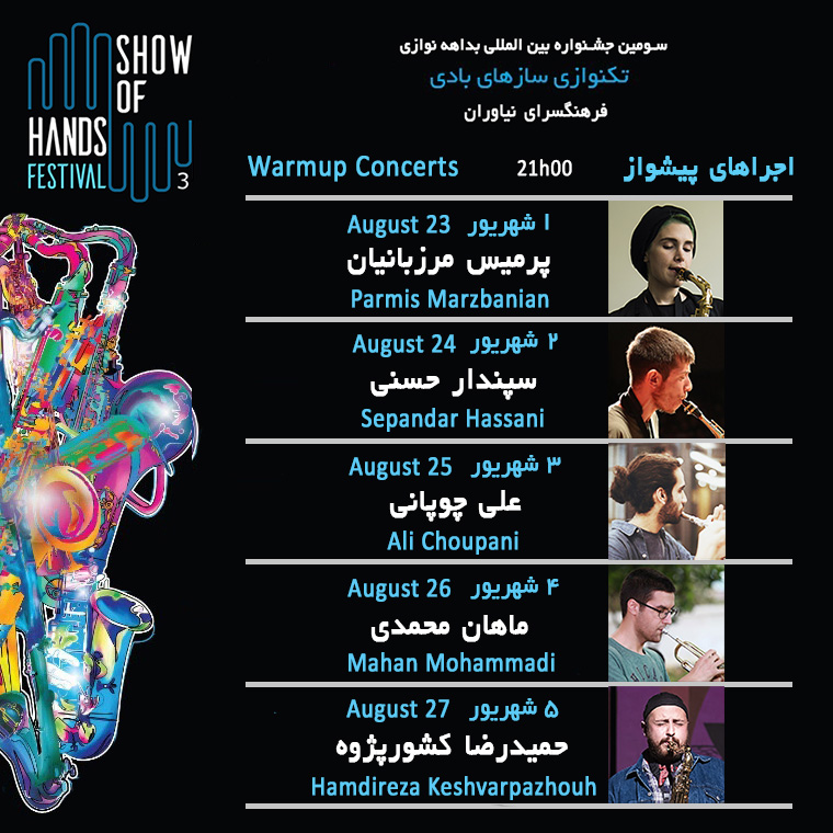 موسیقی ما - سومین دوره فستیوال «Show of Hands» با تمرکز بر بداههنوازی سازهای بادی یکم تا ششم شهریور ماه در فرهنگسرای نیاوران برگزار میشود. فستیوال «Show of Hands» پس از پشت سر گذاشتن دو دوره که به بداهه نوازی سازهای زهی زخمهای و پیانو اختصاص داشت؛ امسال نیز طبق روال سالهای گذشته با دوازده اجرا، هفت کارگاه آموزشی و نمایش رایگان پنج فیلم مستند در باره موسیقی برگزار میشود. این فستیوال نخستین رویدادی است در جهان که با تمرکز بر بداهه نوازی یک ساز بادی برگزار میشود.